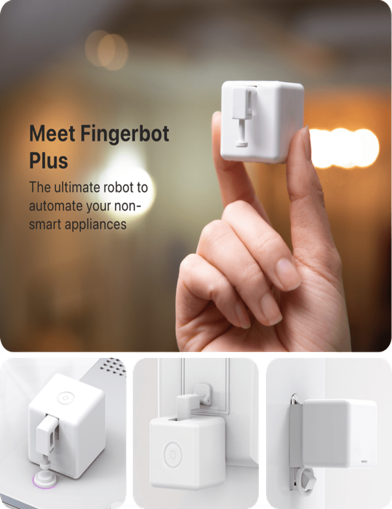 Fingerbot Plus is designed to smart your traditional buttons and switches by helping you physically trigger them. Just peel off the 3M tape it comes with, and you are ready to enjoy. Using with Adaprox HomeHub and Fingerbot Toolpack, more smart functions and scenarios are to be discovered.