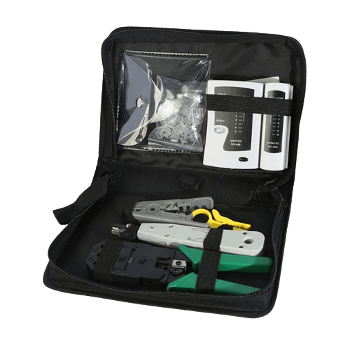 – 4 piece crimping and stripping set (crimper, impact punch down tool, Krone punch down wire insertion tool & wire stripper)